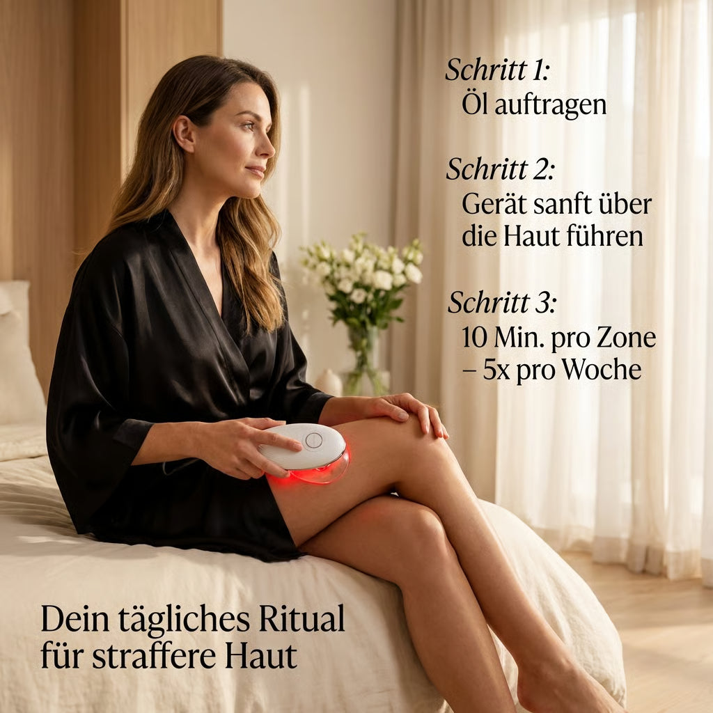 Celuvé Pro 2.0 kombiniert drei klinisch bewährte Technologien in einem Gerät. Keine teuren Studio-Termine, kein Zeitaufwand. Einfach abends anwenden – und zusehen, wie deine Haut Woche für Woche straffer wird.